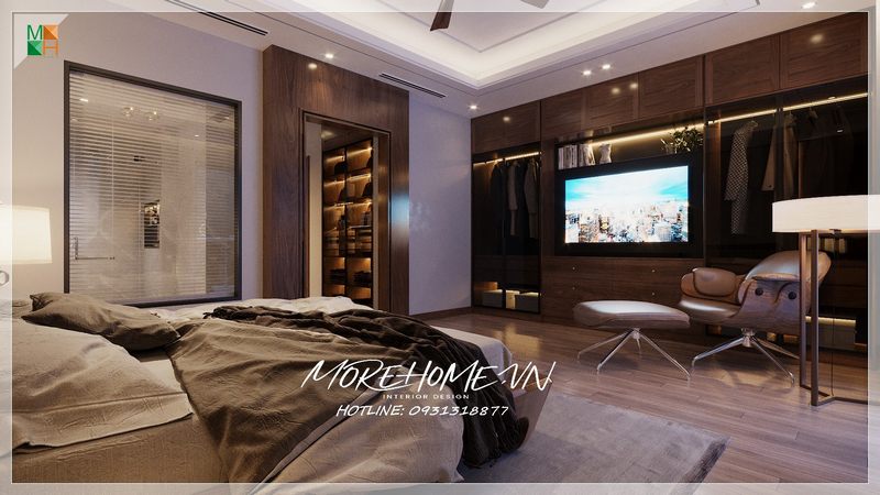 Phòng ngủ được bố trí với một ghế thư giãn để đáp ứng nhiều nhu cầu sử dụng của chủ nhà.